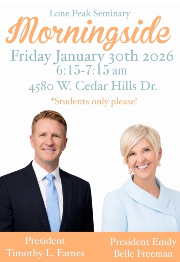 Featuring President Timothy L. Farnes and President Emily Belle Freeman Date: Friday, January 30th, 2026 Time: 6:15–7:15 AM Where: 4580 W. Cedar Hills Dr. (Chapel) Donuts will be served.