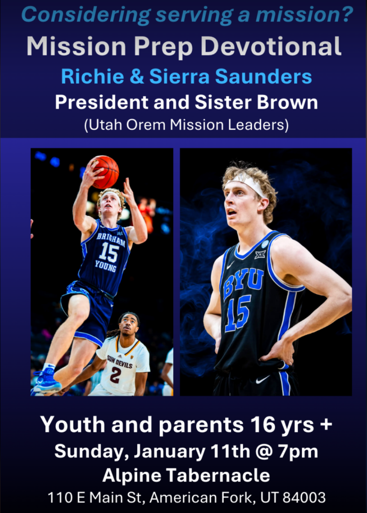 Youth (ages 16 and older) in the Utah Orem Mission, along with their parents and leaders, are invited to a unique fireside with Richie Saunders, BYU basketball player, his wife, Sierra Saunders and President and Sister Brown of the Utah Orem Mission on January 11 at 7:00 pm in the Alpine Tabernacle (110 E Main St American Fork, UT). Richie and Sierra are both returned missionaries and currently serve as ward mission leaders. They, along with President and Sister Brown, will share inspiring and candid insights on serving a mission and how youth (and parents) can best prepare. This is a meeting you won’t want to miss!