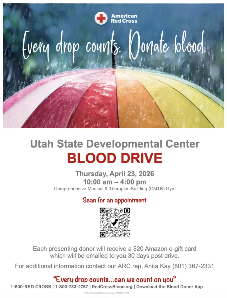 Utah State Developmental Center Blood Drive Thursday, April 23, 2026 from 10:00 am – 4:00 pm Comprehensive Medical & Therapies Building (CMTB) Gym Scan the QR code for an appointment