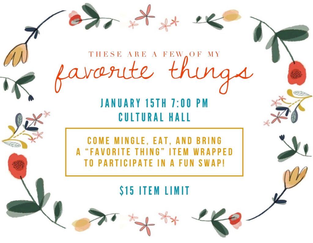The Relief Society is holding a “favorite things” event on January 15th | Time: 7:00pm | Location: Cultural Hall. Contact Sister Hansen with any questions!