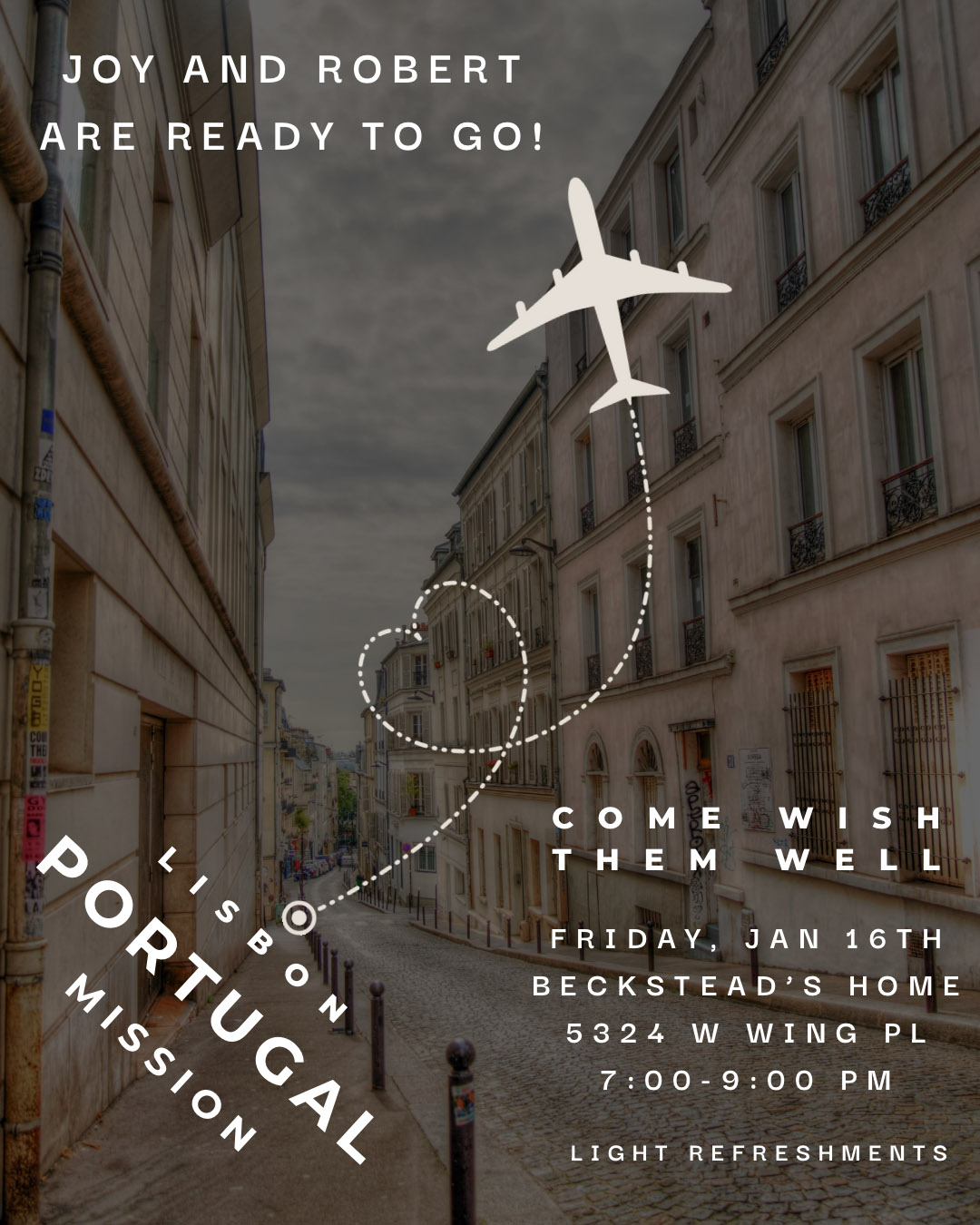 FRIDAY, JAN 16TH | 7:00 – 9:00 PM JOY AND ROBERT ARE READY TO GO! LISBON PORTUGAL MISSION COME WISH THEM WELL BECKSTEAD’S HOME :