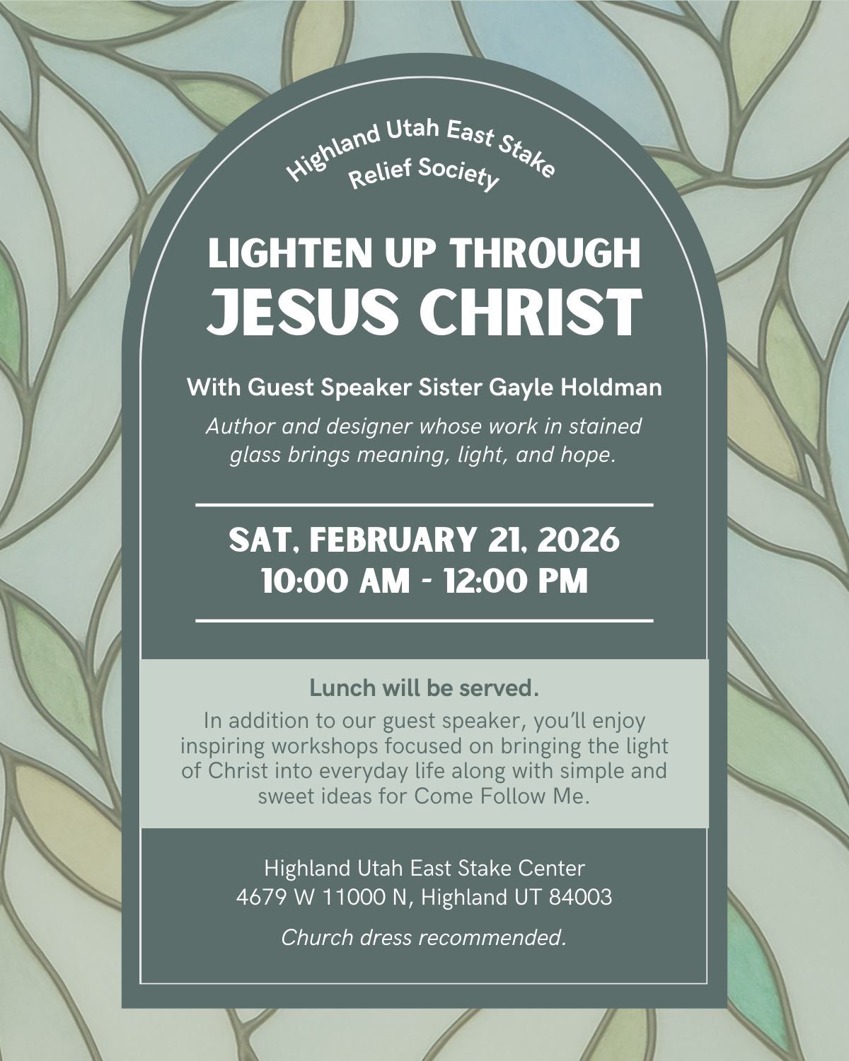 “Lighten Up Through Jesus Christ” Saturday, February 21, 2026 from 10:00 am – 12:00 pm Guest Speaker: Sister Gayle Holdman (Author and designer whose work