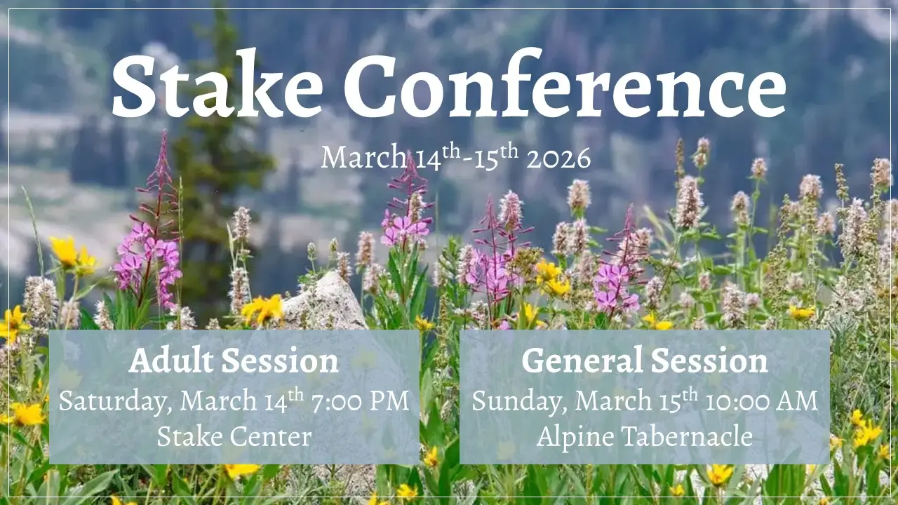We invite all to attend as we strengthen our faith and testimony of Jesus Christ. Adult SessionSaturday, March 14th 7:00 PMStake Center General SessionSunday, March