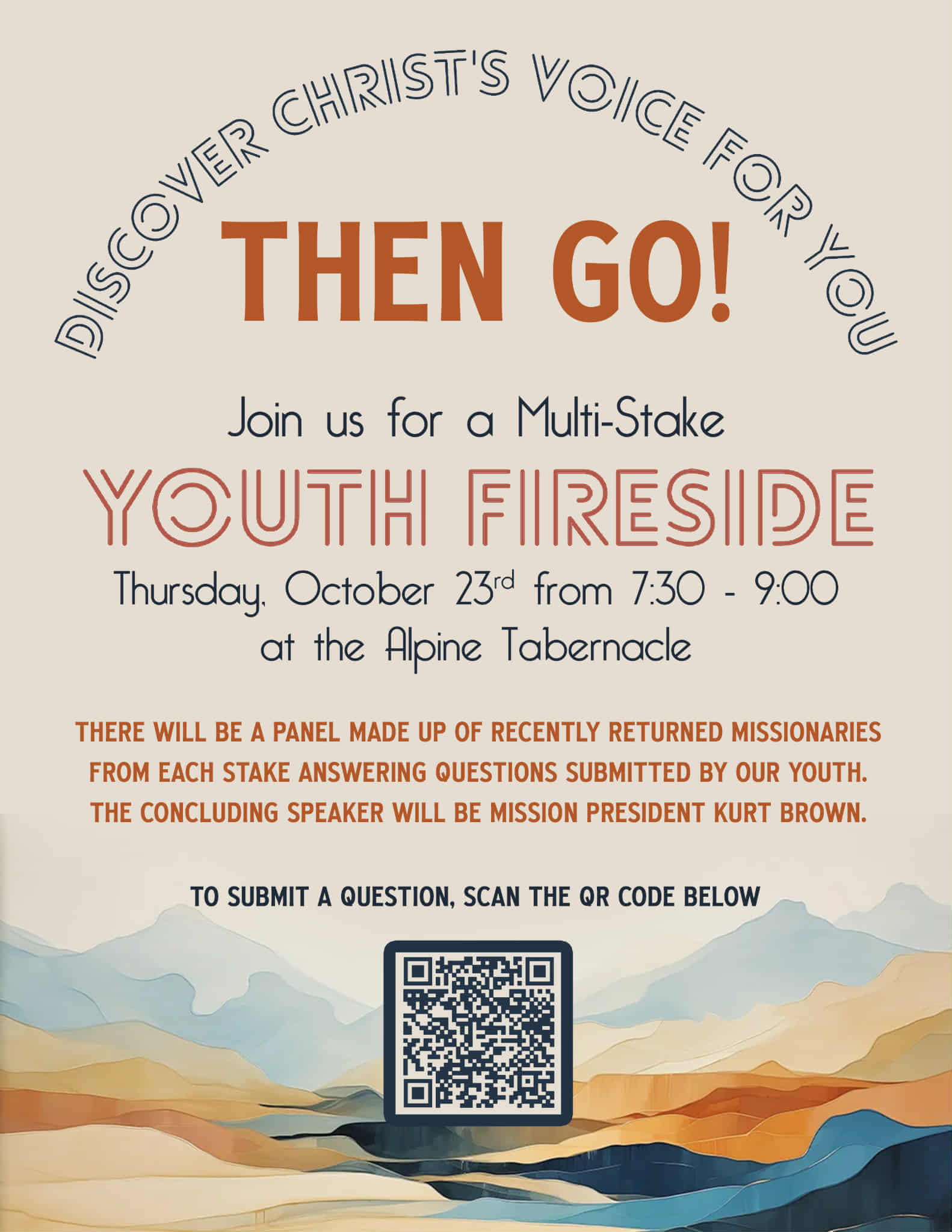 Join us for a panel of recently returned missionaries who will be answering questions submitted by the youth. Concluding speaker will be Mission President, Kurt
