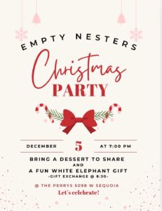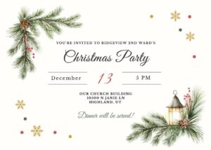 Ward Christmas Party – December 13th at 5 PM Join us as we celebrate the birth of our Savior, Jesus Christ, this Christmas season. Pasta